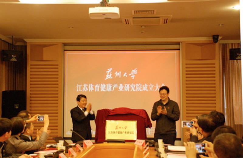 为深入贯彻国务院46号文件和“健康中国2030”规划纲要的精神,“苏州大学江苏体育健康产业研究院(以下简称‘研究院’)成立仪式”于3月17日在红楼会议室隆重举行,研究院的建立是江苏省体育局和苏州大学共同贯彻国务院纲要文件精神的重要举措,是共同合作领域的进一步拓展。苏州大学党委书记王卓君、江苏省体育局局长陈刚、江苏省体育局副局长王志光、苏州市体育局局长周志芳、中国康复研究中心康复信息研究所所长邱卓英、江苏体育产业协同创新中心秘书长王家宏、体育学院党委书记邓国林及校内职能部门领导等共同出席本次大会,江苏金陵体育器材股份有限公司等合作企业的代表参加会议,会议由苏州大学副校长袁银男主持。