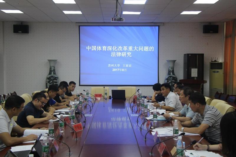 8月1日上午,由苏州大学体育学院国家社科基金重大项目课题组主办,湘潭大学体育教学部、湘潭大学体育法研究中心承办的“中国体育深化改革重大问题的法律研究”专题研讨会在湘潭大学法学院顺利举行。来自苏州大学、武汉大学、西安体育学院、安徽师范大学、江苏警官学院、上海政法学院、浙江传媒大学、河北体育学院、常州大学、常州工学院、湖南科技大学、湘潭大学等10多个教学科研单位的30多名专家学者参加了本次会议,会议由湘潭大学体育教学部部长陈旸教授主持。